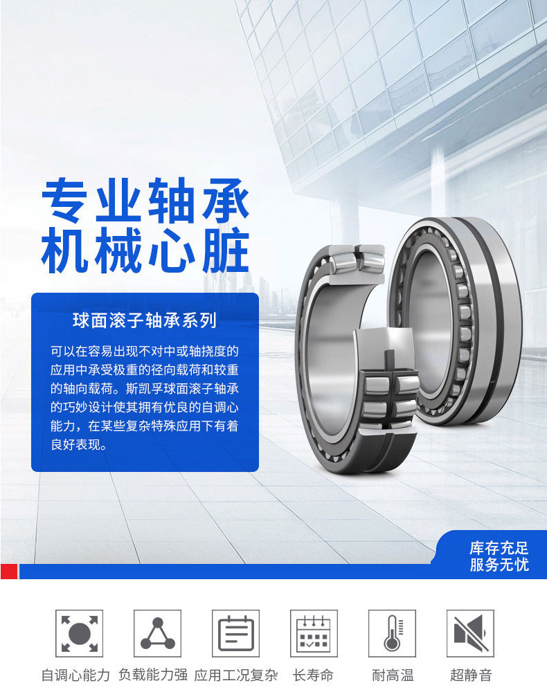 調(diào)心滾子軸承具有兩列滾子,一個共同的帶球面外圈滾道和內(nèi)圈滾道在軸承軸線成一角度傾斜。在外圈的滾道中的球體的中心點是在軸承軸線。因此,軸承,自動調(diào)心和不敏感的軸相對于殼體,它可以,例如,軸的撓曲引起的未對準。調(diào)心滾子軸承設(shè)計用于承受重徑向載荷,以及在兩個方向的軸向載荷重。